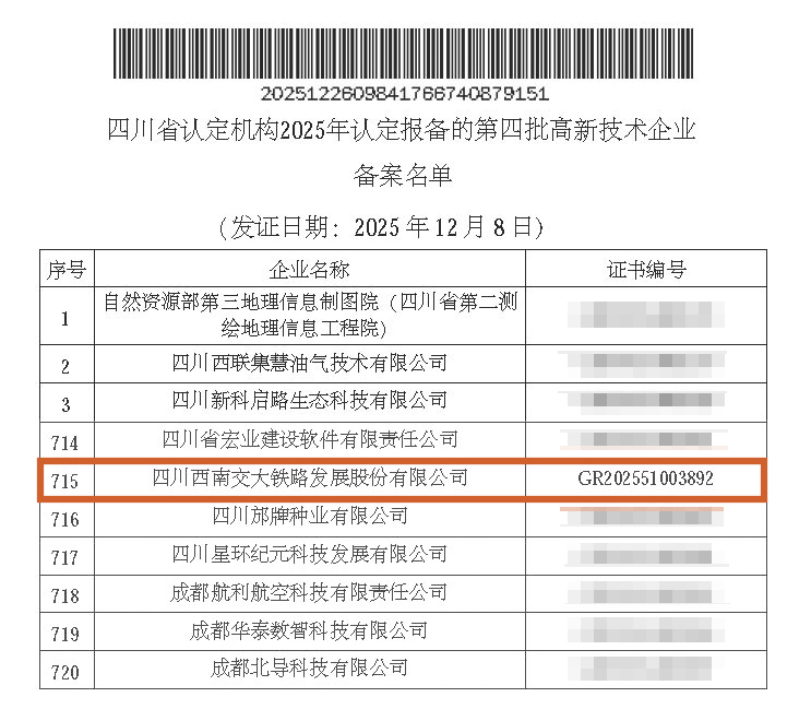 近日,全国高新技术企业认定管理工作领导小组办公室发布《对四川省认定机构2025年认定报备的第四批高新技术企业进行备案的公告》,公司凭借扎实的技术研发实力、突出的创新成果,成功再度荣获“国家高新技术企业”认定!
