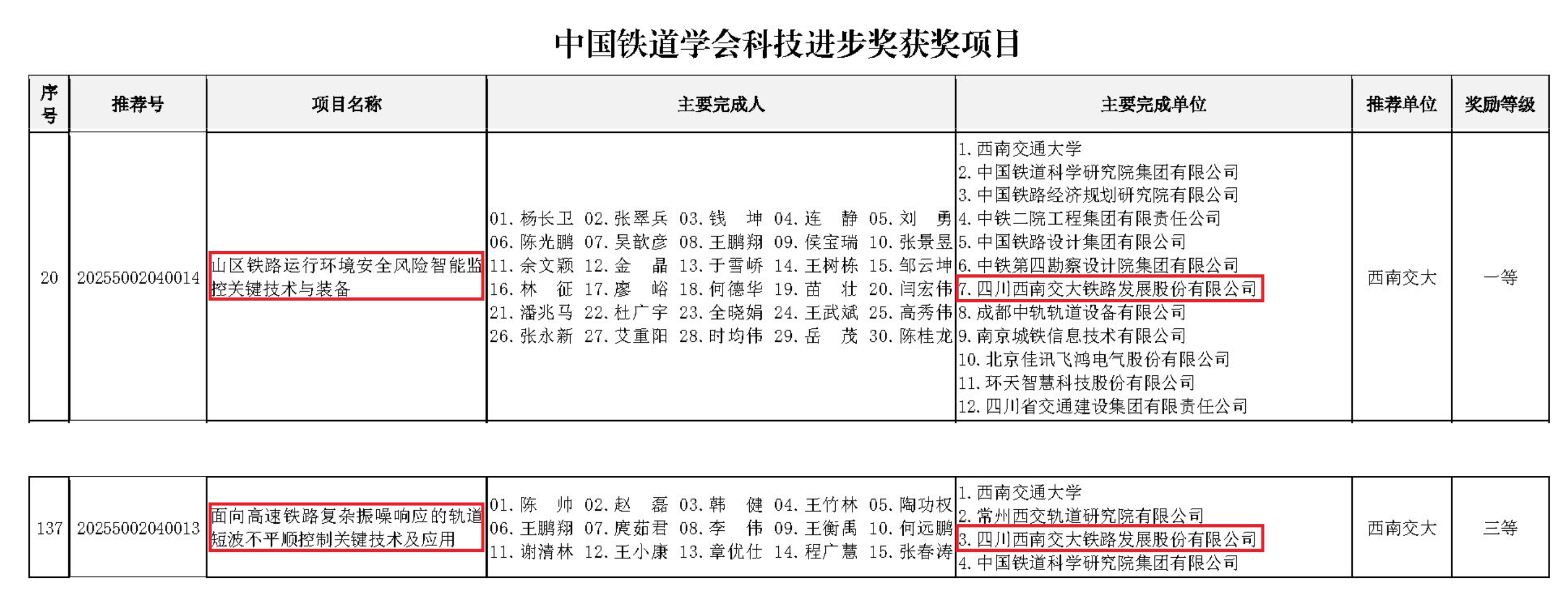 近日,中国铁道学会公布2025年度中国铁道学会科学技术奖获奖名单,公司参与完成的“山区铁路运行环境安全风险智能监控关键技术与装备”“面向高速铁路复杂振噪响应的轨道短波不平顺控制关键技术及应用”项目分获2025年度中国铁道学会科技进步奖一等奖、科技进步奖三等奖。